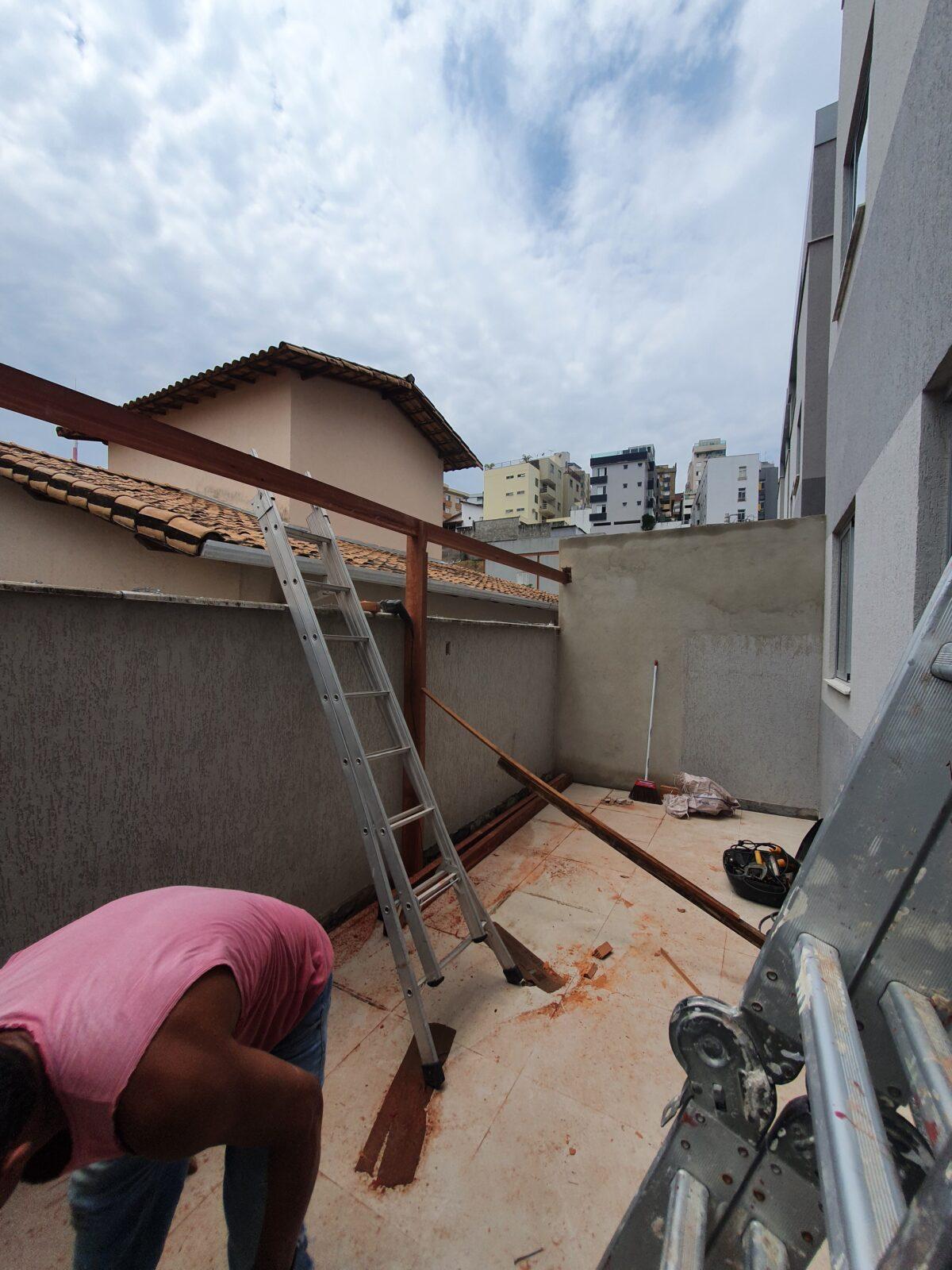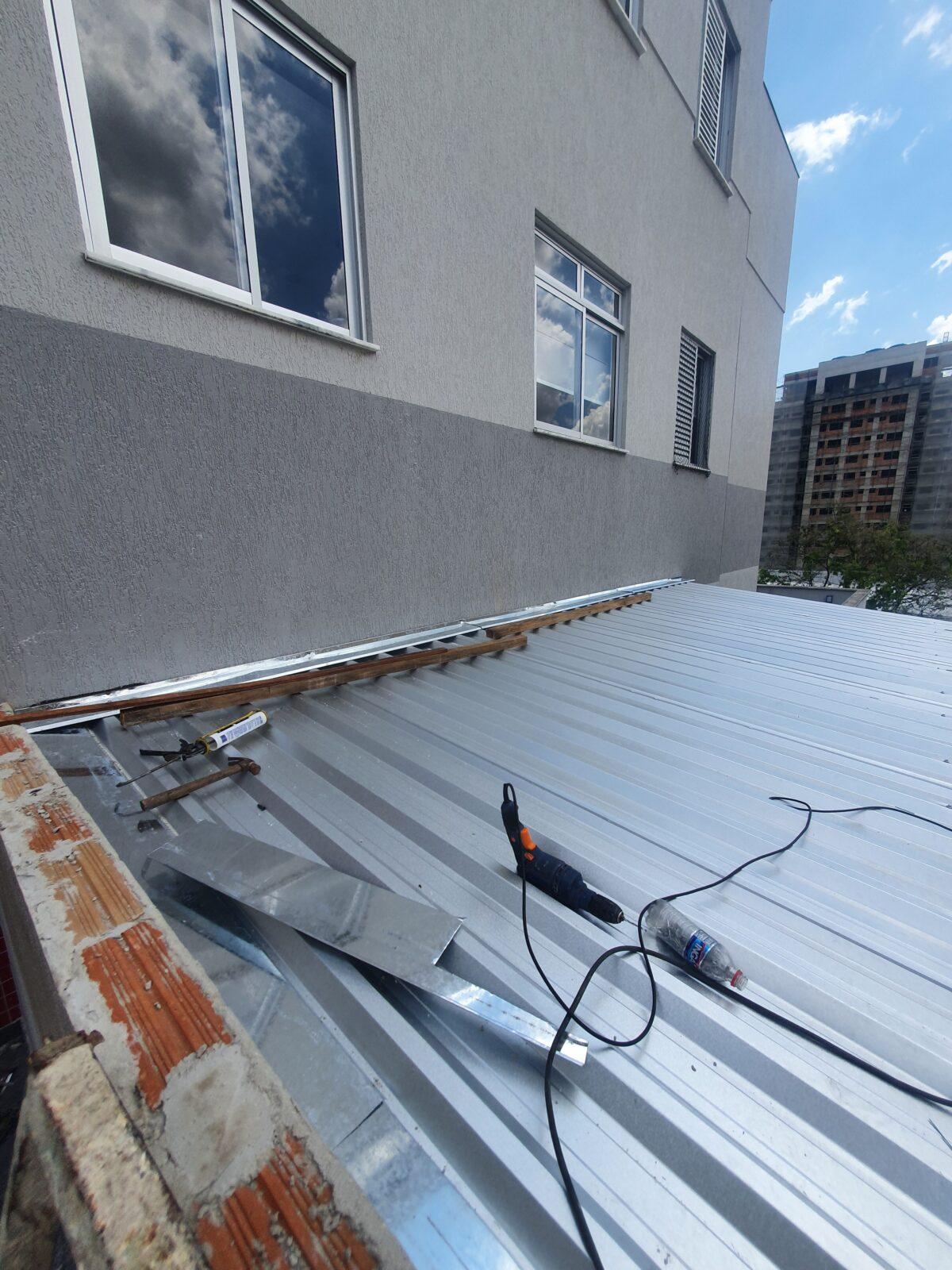 Dando prosseguimento partimos para a cobertura da área, onde a estruturação do telhado foi feito com madeira Paraju e sua cobertura com telha termoacústica galvanizada, para finalizar a cobertura instalamos rufos e calhas.