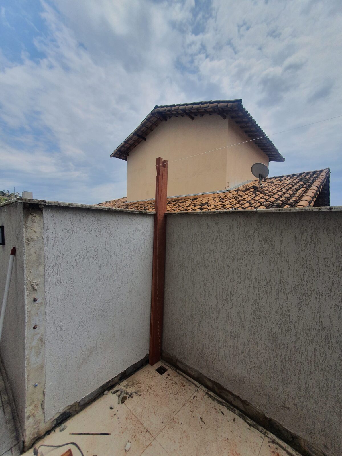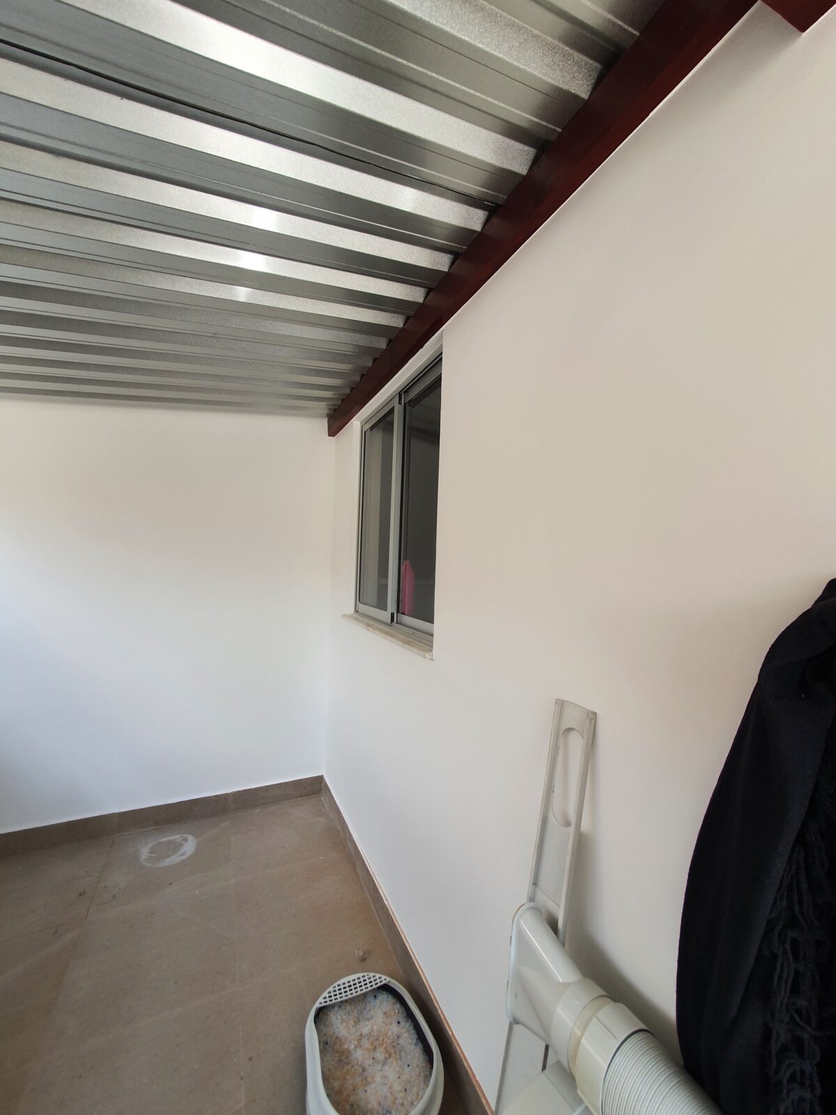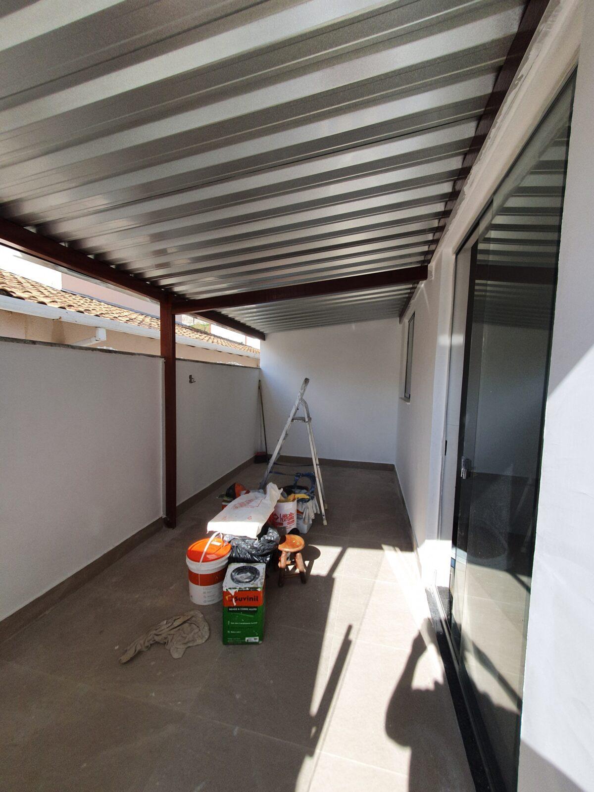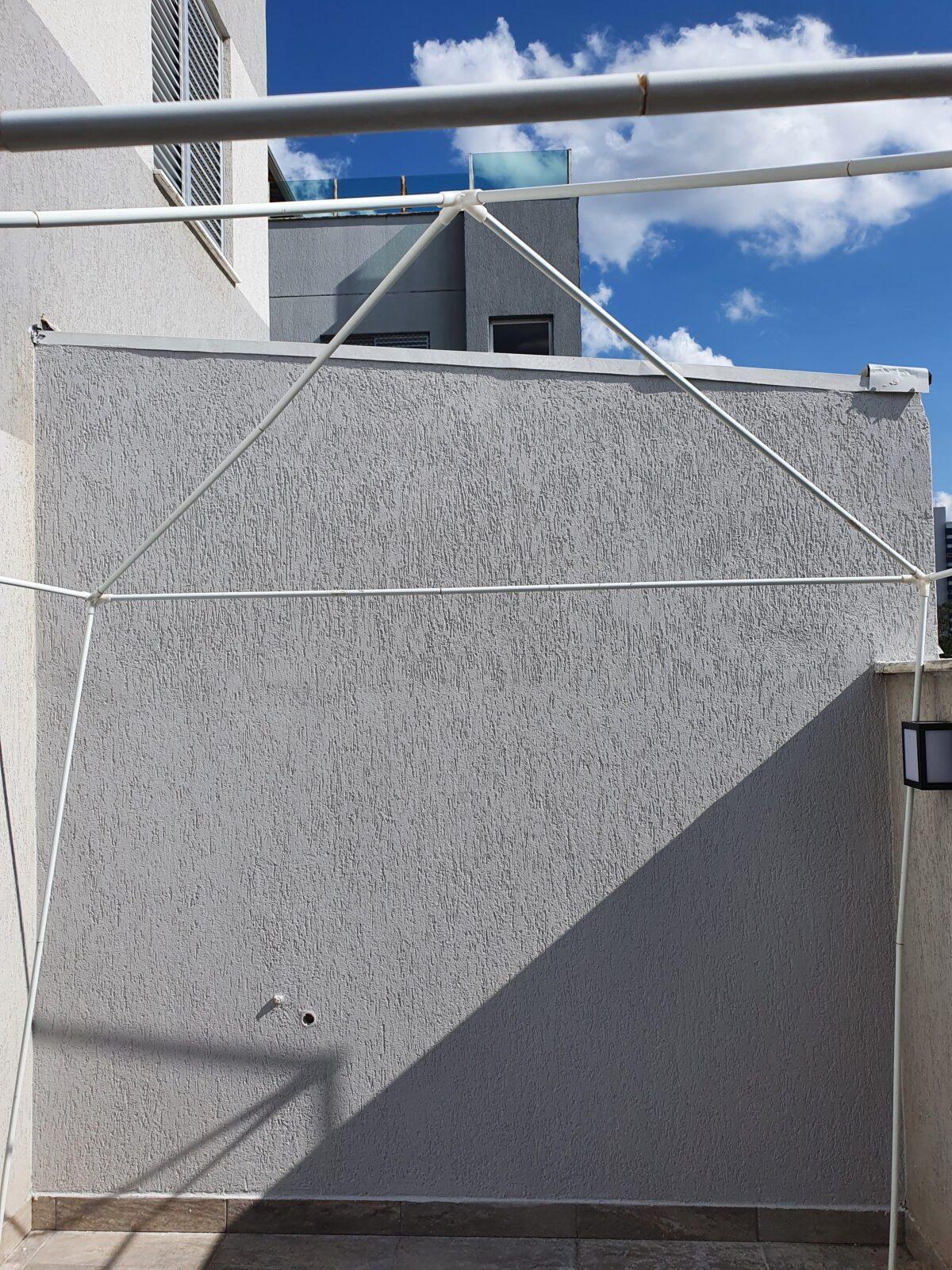Na fase final envernizamos as madeiras do telhado e na área coberta foi feito o emassamento total com o intuído de retirar o grafiato existente. Posterior a isso foi feito a pintura de todo o ambiente. Nessa fase também foi realizado o grafiato na nova alvenaria que construímos para separar a área privativa da área comum do condomínio.