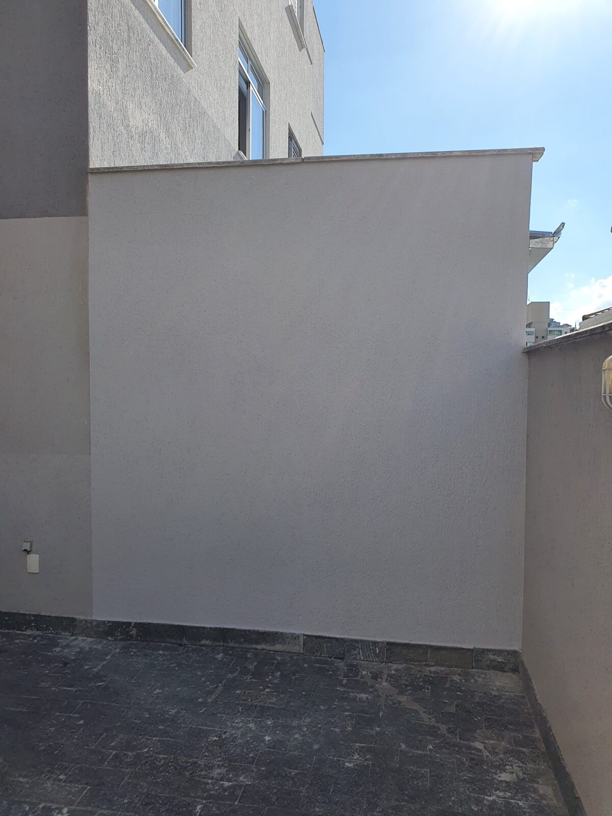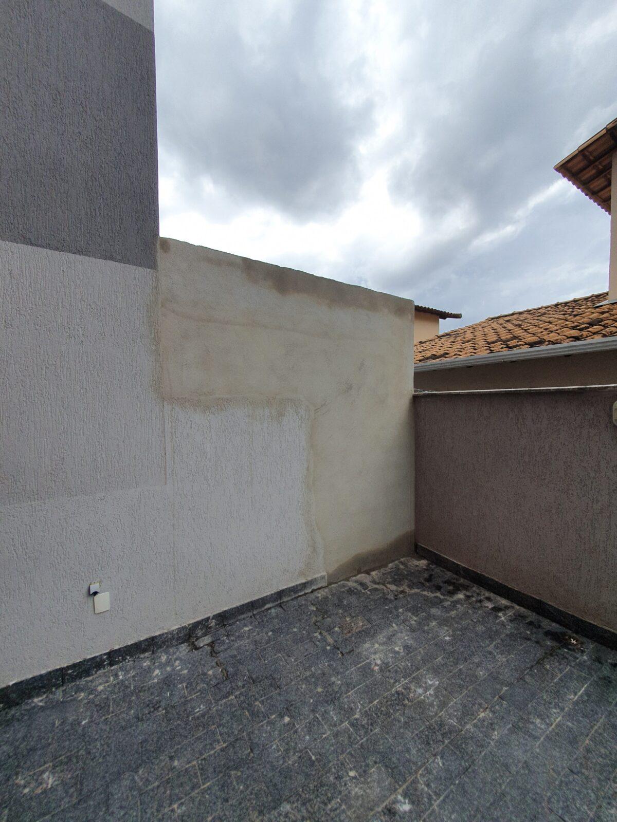 Nos fundos da área privativa também foi realizado uma intervenção. O vizinho ao fazer a cobertura de sua área deixou um acabamento não muito bonito para nosso cliente. Portanto, nesse local fizemos a diminuição do rufo e fechamento em alvenaria, depois foi realizado o reboco e para finalizar um grafiato, buscando ao máximo equipar com as cores já existentes no local.