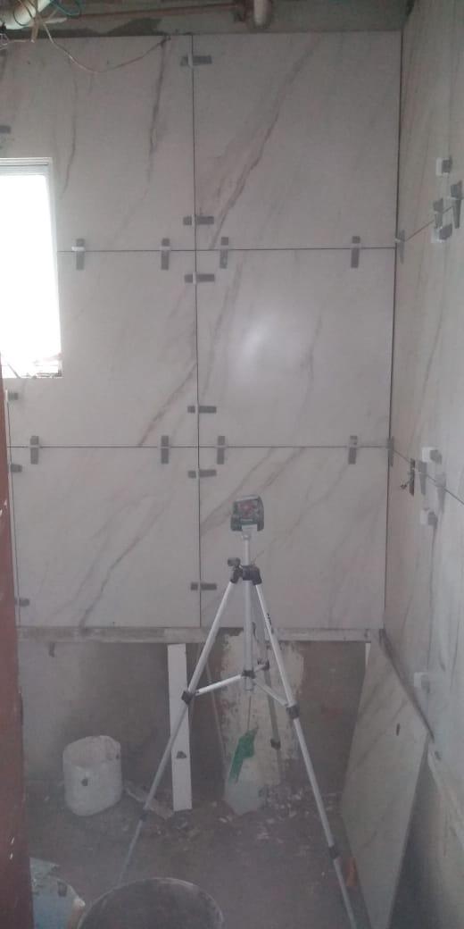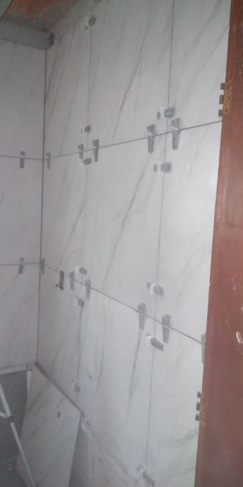 Prosseguimos com o assentamento do porcelanato e rebaixamento do teto utilizando placas de Drywall resistentes a umidade.