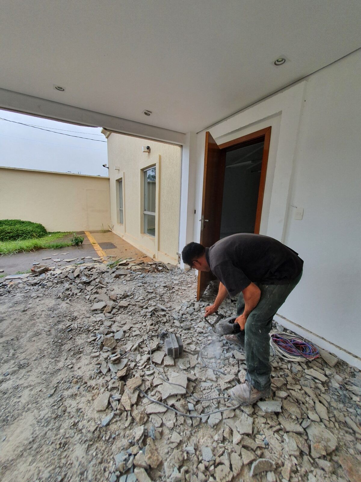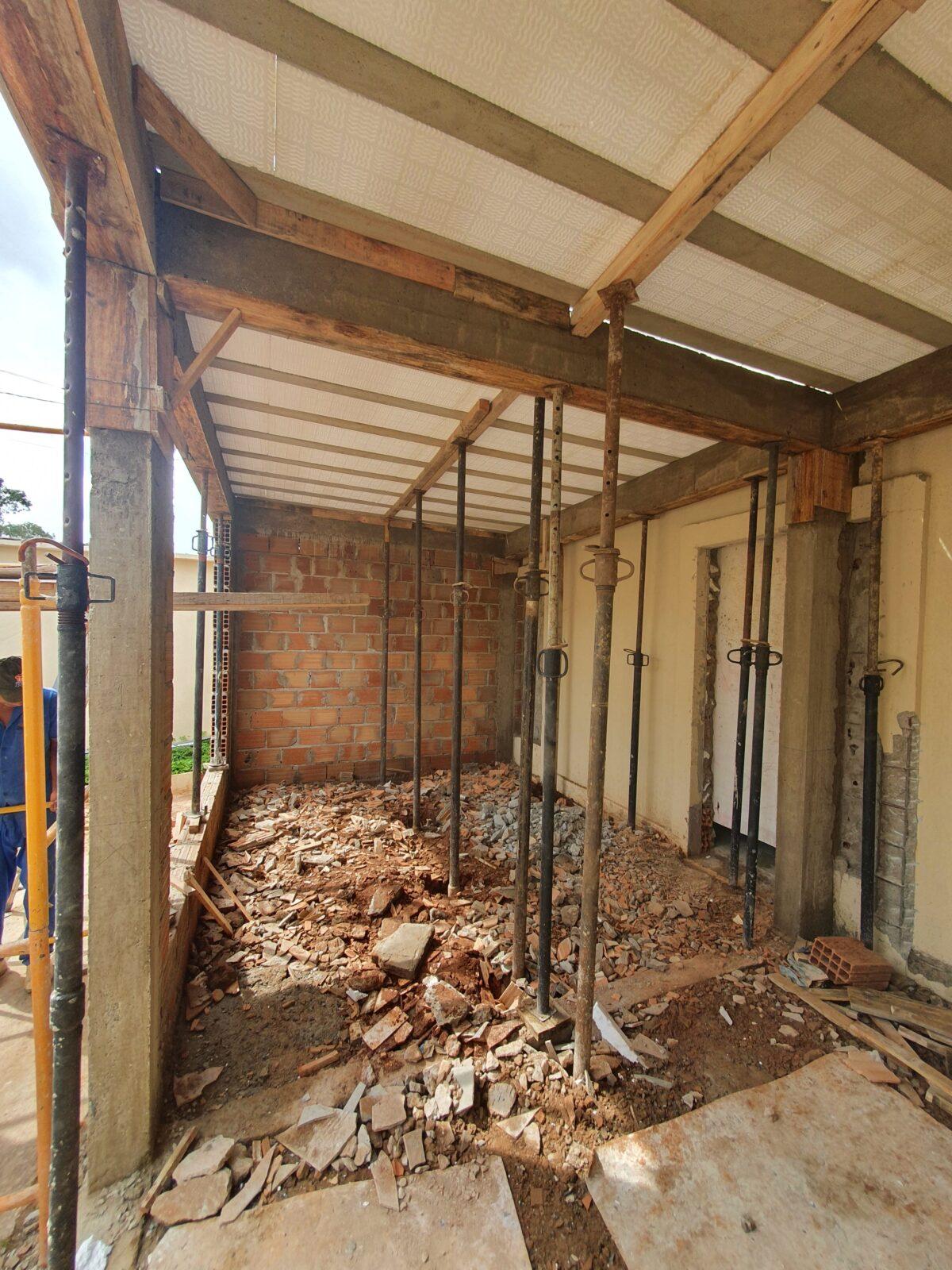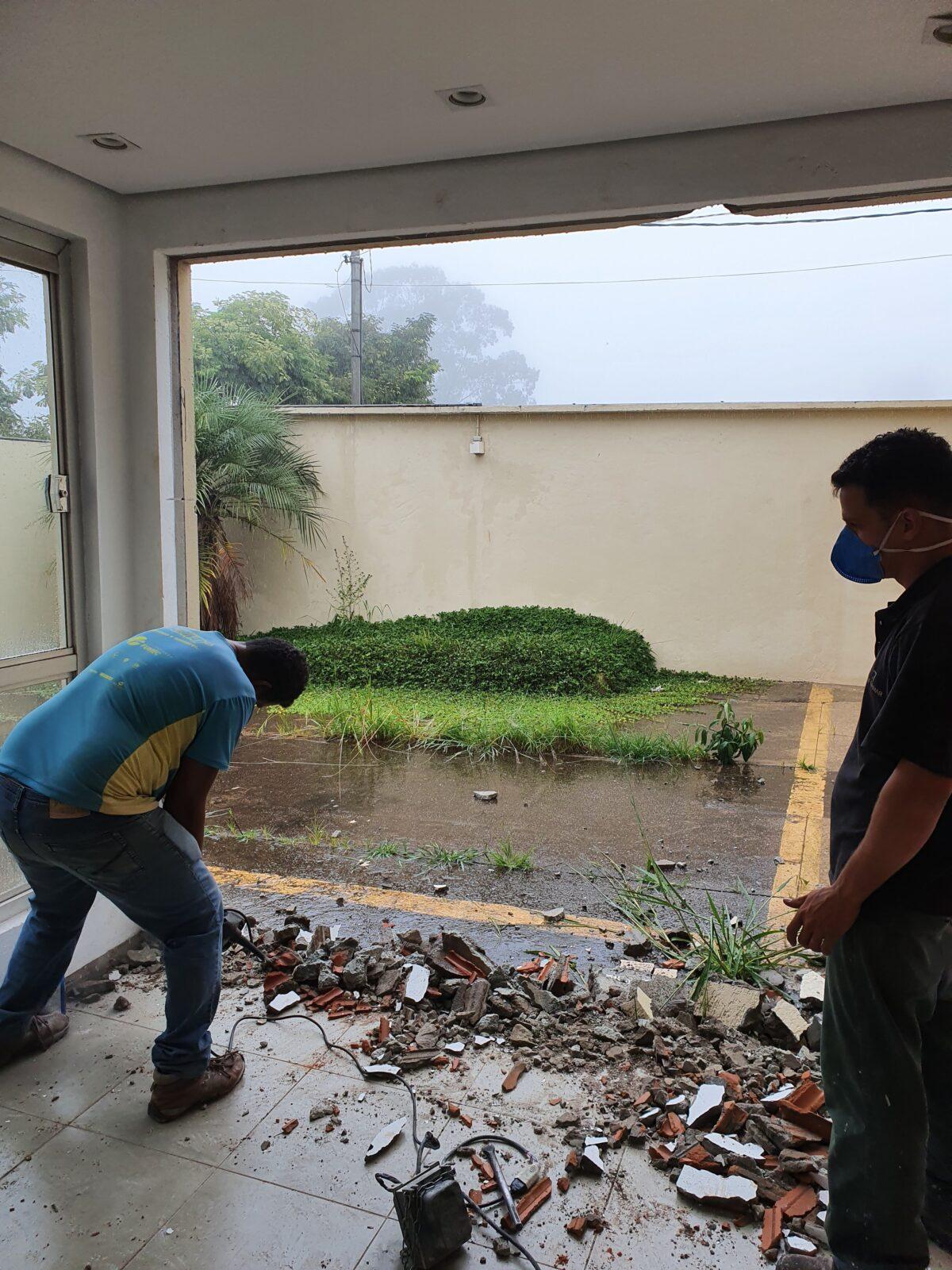 Iniciamos a obra demolindo uma parede da área de recepção para ampliação do espaço, posterior a isso foi realizado a demolição de todo revestimento do piso.