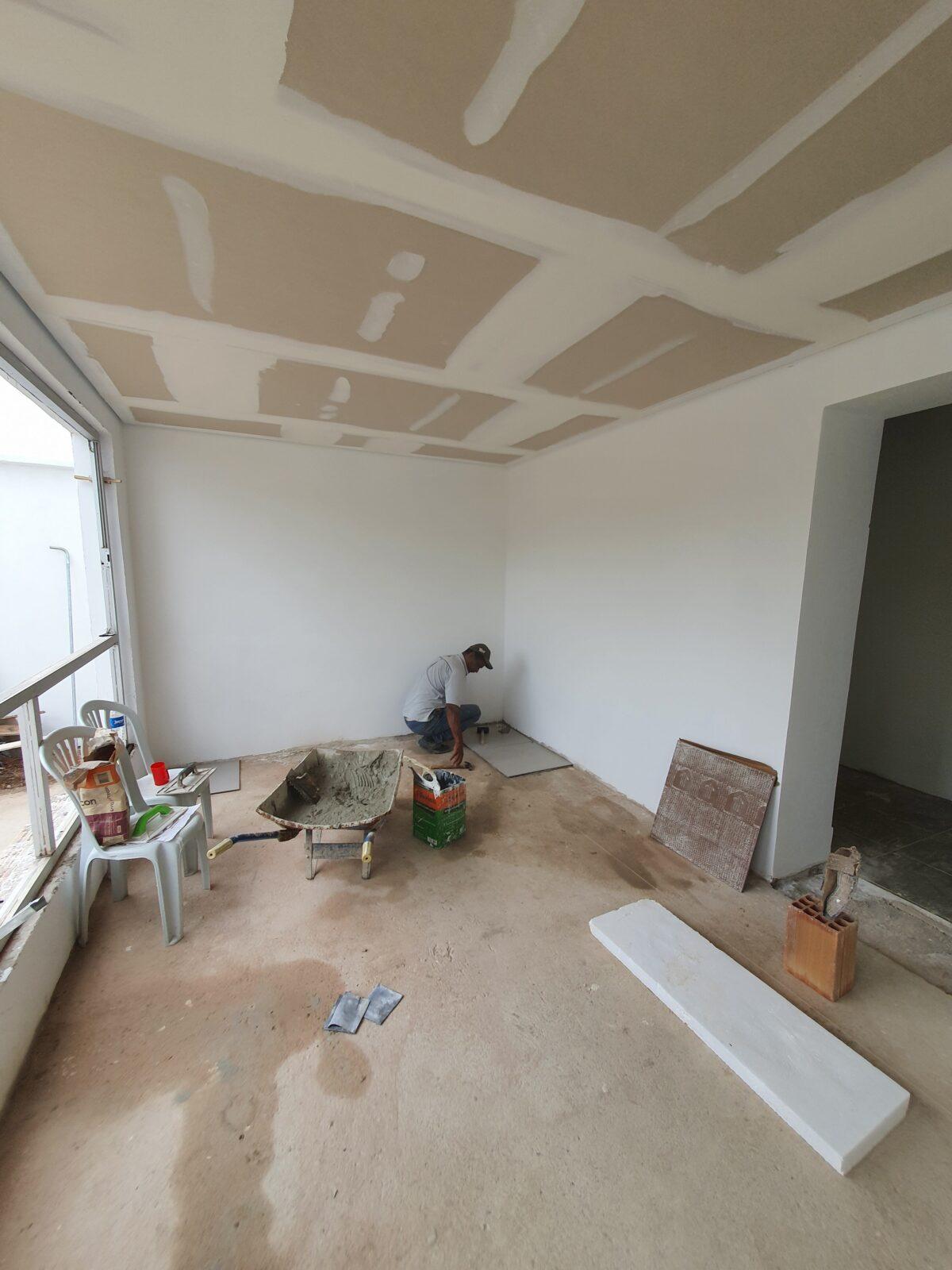 Na fase de acabamento foi passado toda a infra elétrica e realizado o rebaixamento do teto com forro de geso liso, além do assentamento do porcelanato 60 x 60 no piso.