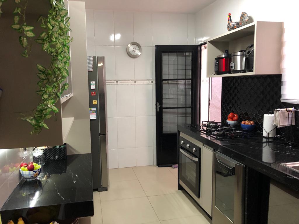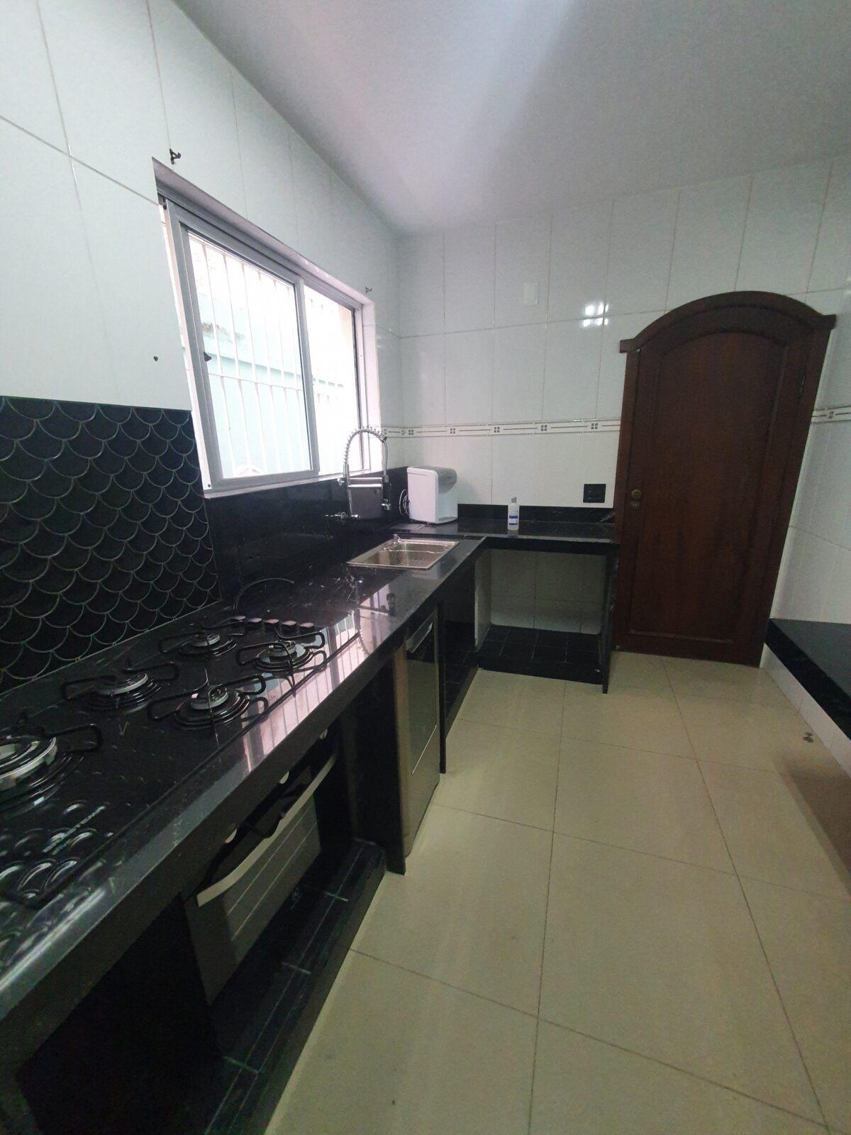 Posteriormente, na bancada do cooktop foi instalado pastilha preta na parede e na bancada úmida uma rodabanca do mesmo granito escolhido para bancada.