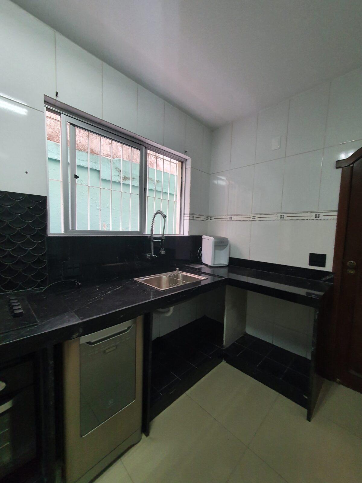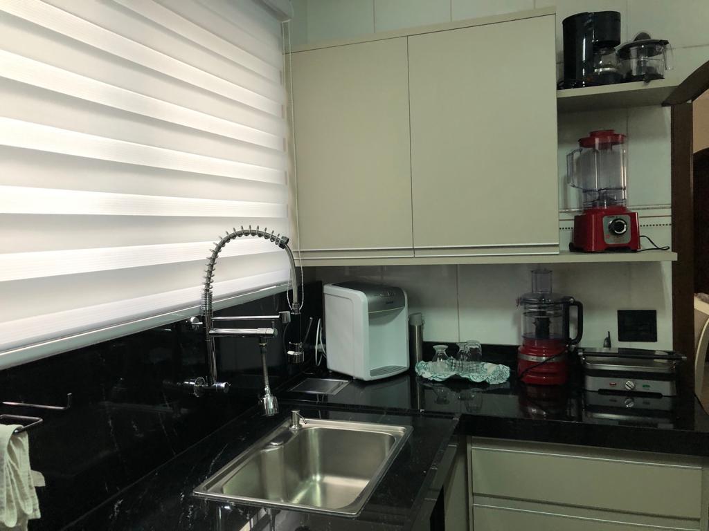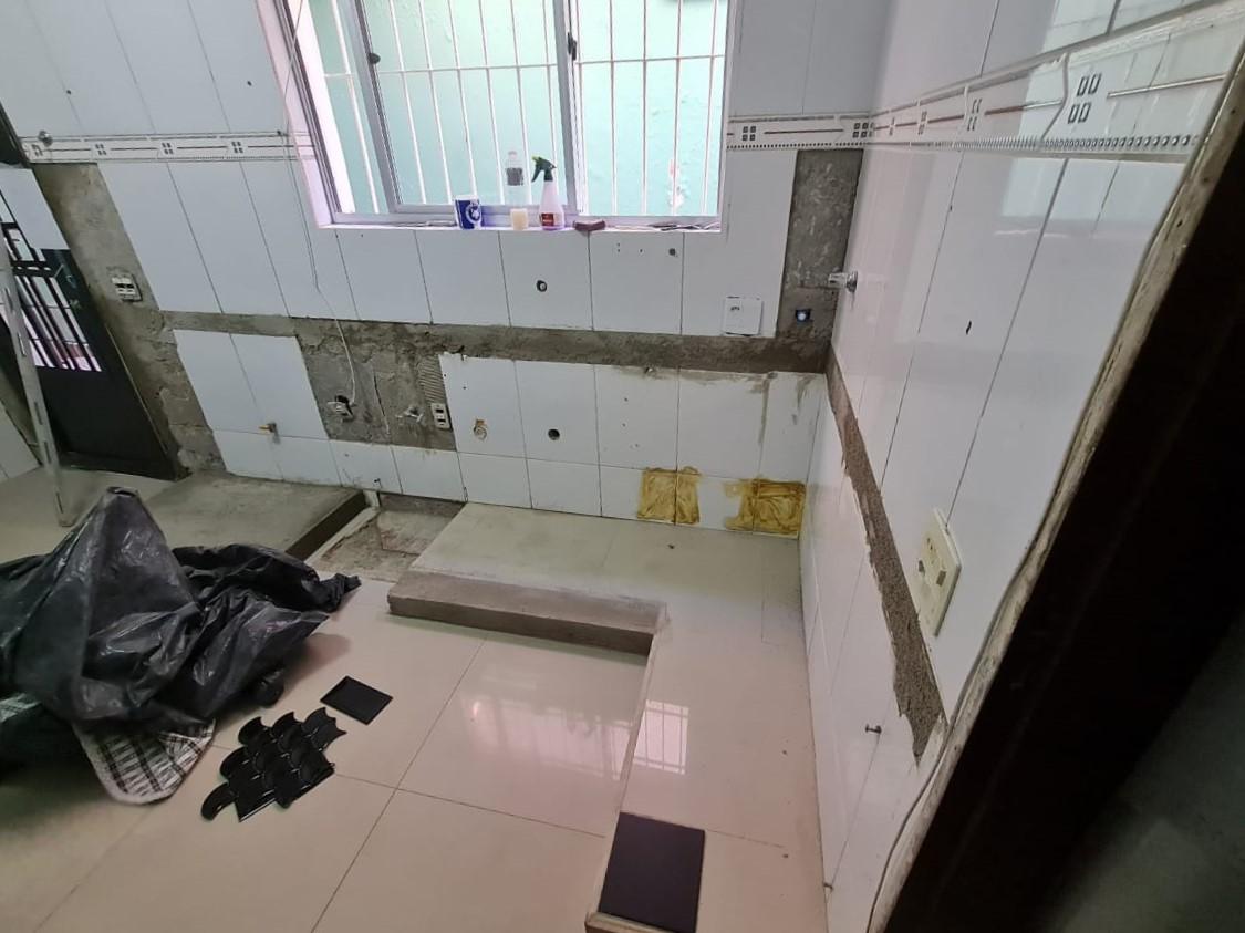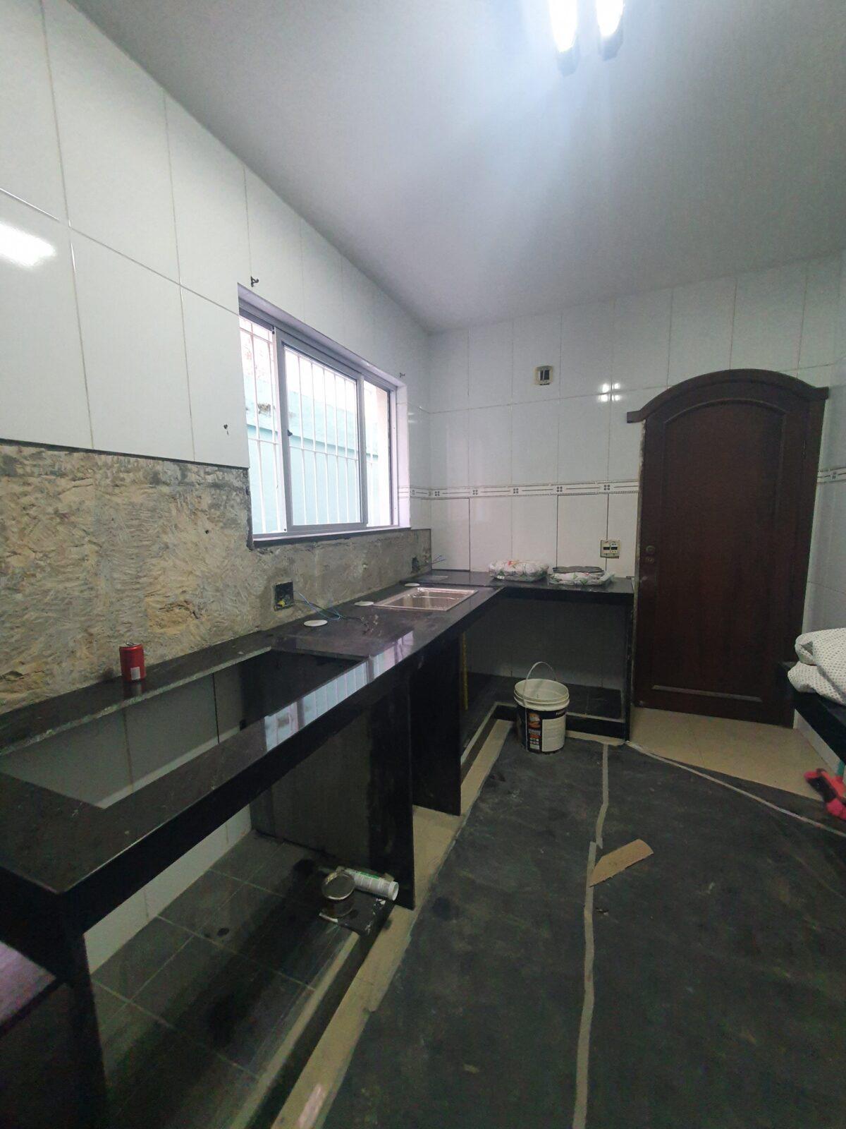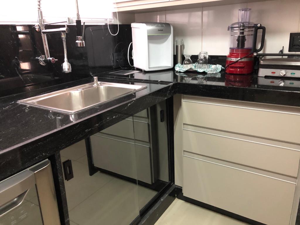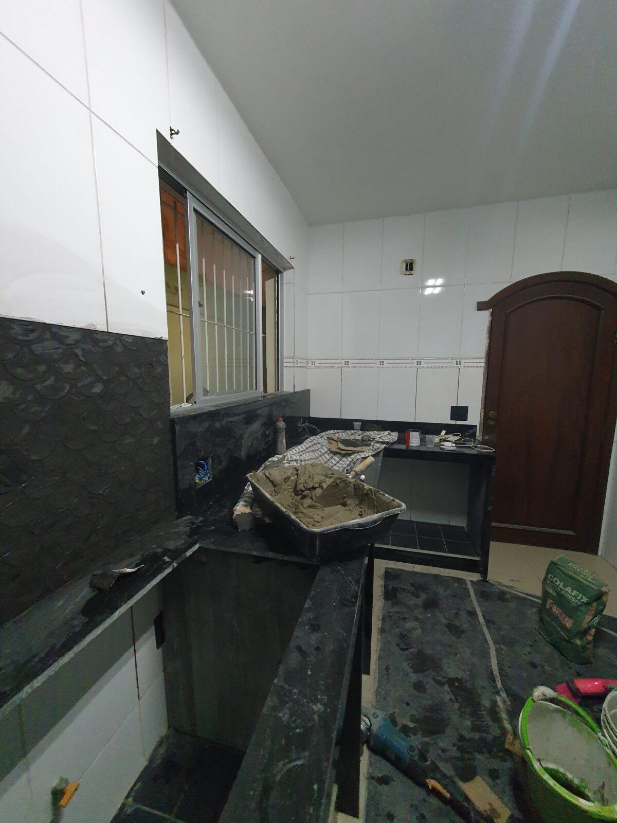 Iniciamos tirando todos as bancadas e armários existentes, depois disso foi instalado uma bancada em granito via láctea com formato em L e para finalizar essa etapa foi feito toda a calafetação das bancadas.